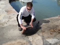 Nevolja je u tome što sam sekund prije griza smotao timun u krivu stranu i dao gas, sada mi se brod okreče a najlon se naslanja i skreče oko šipke koja drži produžetak nadstrešnice. Prebacujem ruku i vatam najlon s druge strane šipke, ovaj doli divlja k’o sumanut, izbija mi 2 metra najlona iz ruke, olova razbijaju po prstima, brod sve više vata zalet i skreće u stranu. Ne mogu doći do komandi, a ne mogu zubaca potegnuti ni deset centimetara, puštam najlon da klizi kroz ruke dok idem prema komandama, smanjujem gas i vrtim timun na drugu stranu. Vračam se nazad na krmu, on još uvijek nezaustavljivo divlja glavom i pumpa k’o da nikad neće stati, nikako da mu okrenem glavu prema sebi, opet mi izbija koji metar s olovima, ruke bole ko sam vrag, potekla je i krv. Kako ja povučem paš sebi, tako on izvuče paš najlona nazad, uz obavezno novo razbijanje prstiju olovnicama. Teško je opisati tu količinu adrenalina koja mi prolazi cijelim tijelom, a nikako ga ne mogu odlijepiti od dna.